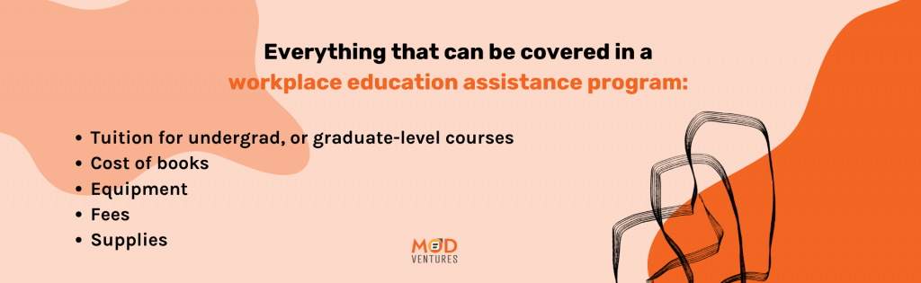 Your education assistance program can look a number of ways. Some companies choose to assist with tuition, others offer grants. Here is a list of everything* that can be covered in a program like this: tuition for undergrad, or graduate-level courses, cost of books equipment, fees, and supplies.
